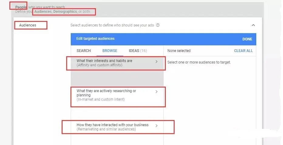 以上,就是关于基于人(people)的定向,可以发现其中基于audience的定向类型是我们格外需要注意的,其中包括基于兴趣的affinity,基于动机的intent和基于已经和网站发生交互的人群的定向。
