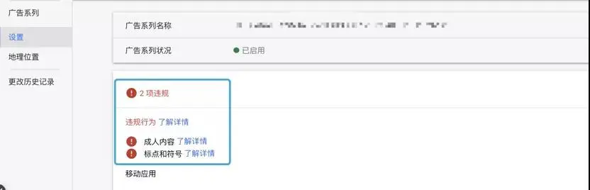 需要到Campaign下的素材设置页面去看看想一下是否有红色字体的违规行为出现,如果出现红色的违规行为,建议检查下素材,及时关掉;检查后确认没有类似行为但是还是提示违规的,建议到谷歌申诉页面进行素材申诉,尽量去掉违规标记。虽然现在并没有明确说这个违规情况的影响,但素材违规超过一定的比例确实会影响展示。