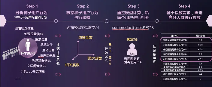 广告主提供购买过品牌/安装了品牌APP/访问过品牌官网/点击过品牌广告/品牌会员…的设备号或手机号,上传到爱奇艺DMP系统,即可匹配生成品牌专属人群包。