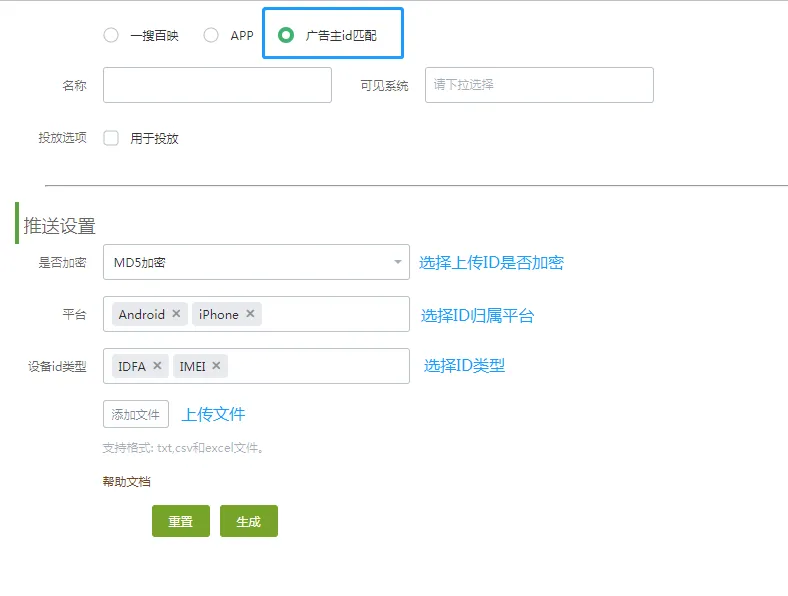 平台支持多种数据类型以及加密格式,广告主只需按照格式要求上传文件,系统就会完成自动匹配。