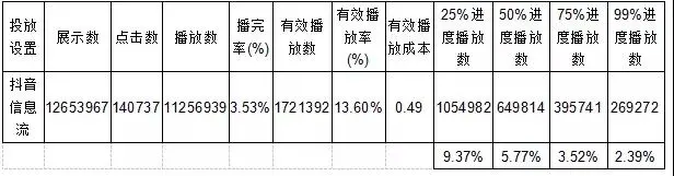 统计大量抖音视频广告后台播放数据可以发现,以时长30s的视频为例,当视频播放进度在25%(7.5s左右)时,用户的流失率已经高达90.63%,而看完视频的用户只剩下了2.39%,因此,视频播放进度在25%(7.5秒左右)时,这里面的内容就是广告能否产生转化的关键。如果前7.5s左右内容不能瞬间抓住用户的注意力,那么这条视频广告注定会失败。