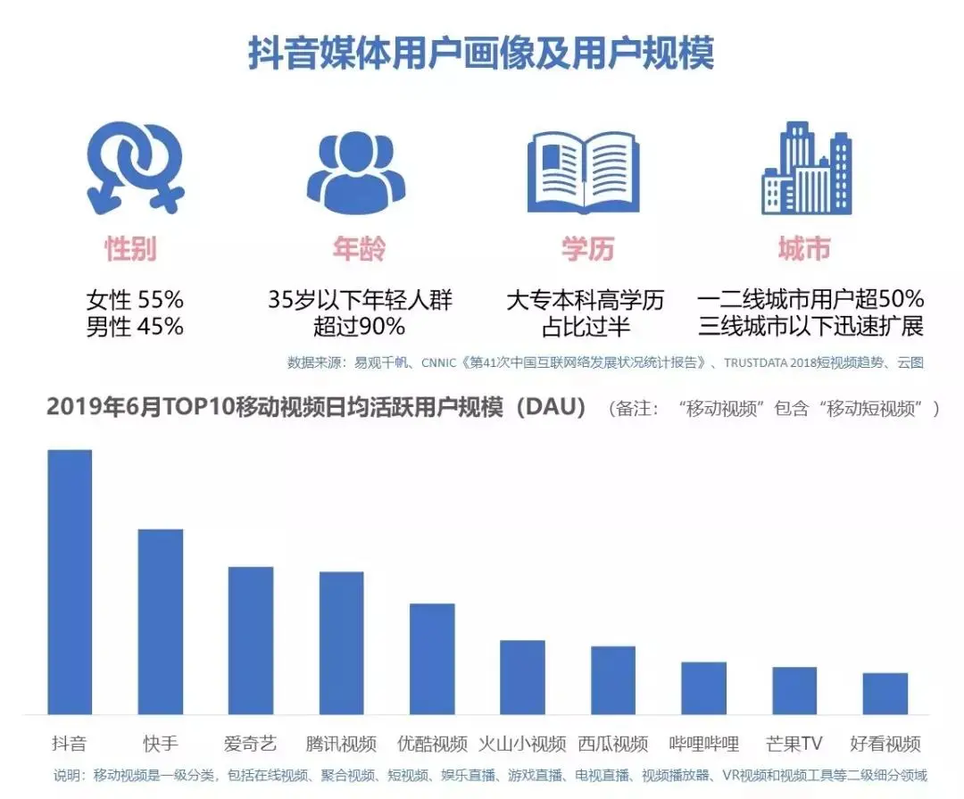 短视频风口下的抖音,在今年7月份已实现国内DAU3.2亿,相比18年7月的DAU1.5亿实现翻倍增长,增长势头依然强劲。抖音用户多为高学历高品味高消费的年轻群体,女性用户较多,超9成为35岁以下年轻用户,主要分布在一二线城市,并迅速向三四五线城市扩展。