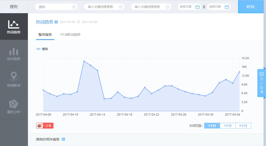 在搜索框中输入你需要搜索的关键词,例如:搜狗,然后你就可以看到如下的搜索结果,可以看到该词的搜索数据。