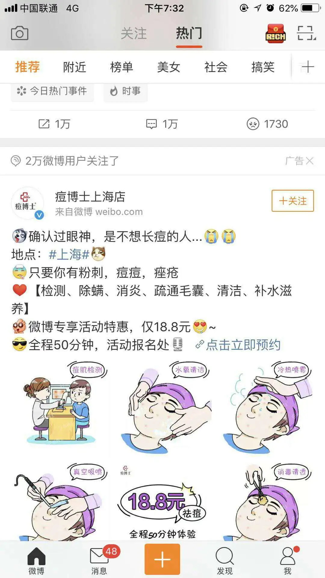 不得不说现在的人越来越重视护肤美容,对于脸也是非常的看重。美容行业也就迅速发展,成为了现在比较暴利的行业。利用微博的地域定位,可以选择地域性的广告投放,上图是定位在上海的一则广告。