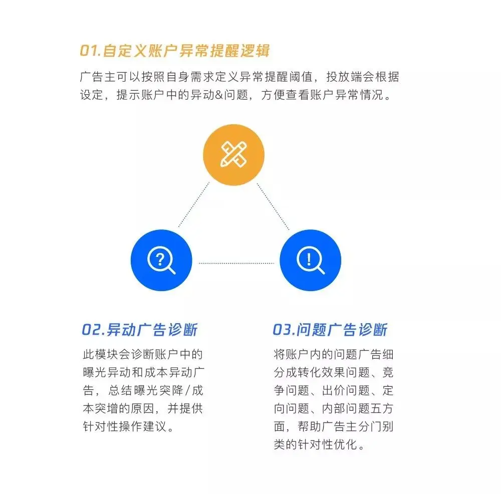 诊断工具根据广告主对异动/问题判定标准设定的阈值,主动在账户首页和广告列表处提示异常广告,并为广告主归因出发生异动的根源。