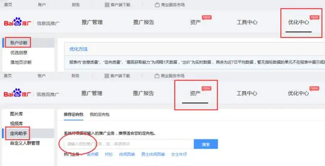 另外,百度的智能推荐还是非常人性化的,登录网页客户端,分别点击「优化中心——账户诊断」和「资产——定向助手」,系统会推荐一些比较优质的定向包和意图词,用不用随意。
