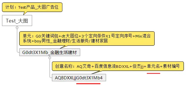 ③ 创意名:公司名+媒体名+投手名+关键词编号+广告位缩写+兴趣定向数量X兴趣定向编号+平台+性别+素材编号+文案编号【eg.AQBDXXLjjG0dt3X1Mb4】