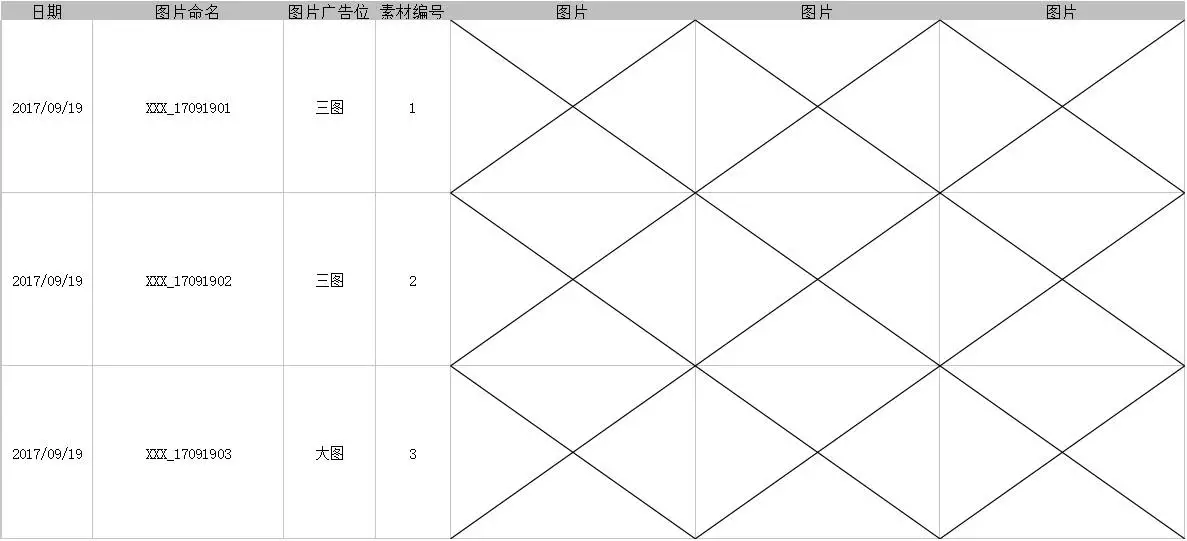 提前让设计师做不同广告位的素材,我习惯每次3组,拿到设计师素材后,先给「素材编号」方便命名渠道码。具体的编号看团队是公用素材库还是个人素材库。我是个人库,所以是每个产品都单独从1开始编号,表格记录上传时间、图片命名、广告位、图片编号、图片,如图示。