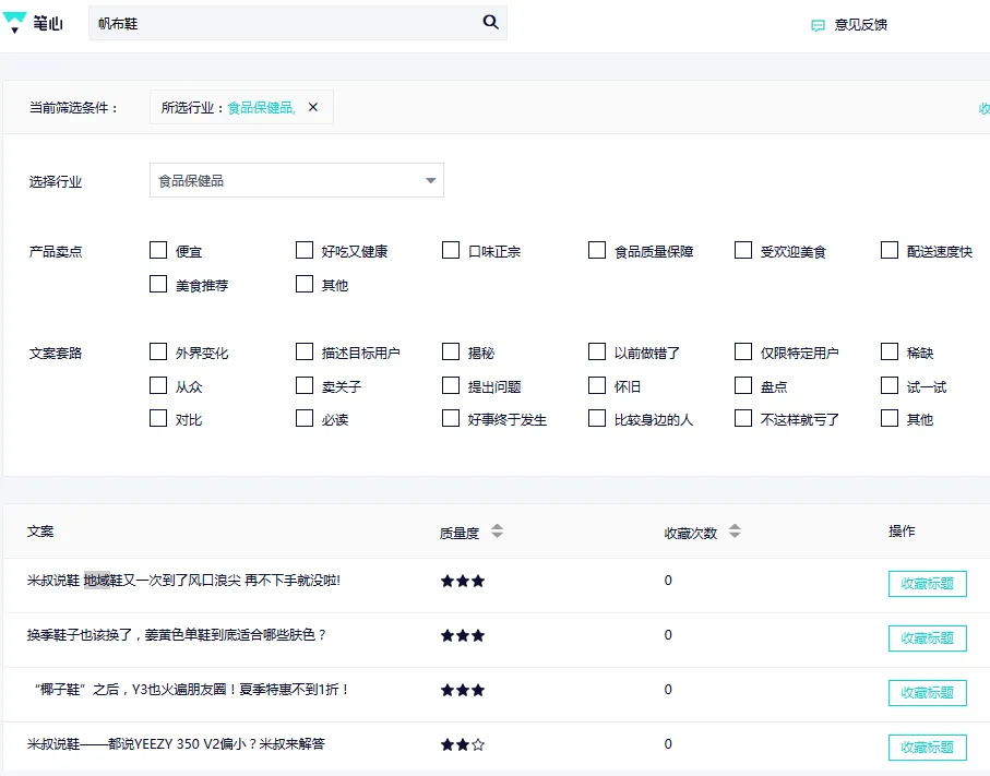 文案怎么写是大课,好文案都是钱磨出来的,但秉承快速上计划的原则,我推荐百度自带的「笔心创意引擎」(网页客户端——推广管理——Feed创意工具),直接搜索产品词,系统会罗列优质文案给你挑,还有什么比照抄更快的吗?