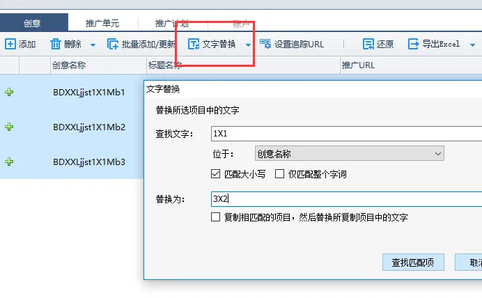 操作步骤:在Excel表格中为素材建立编号→对应单元修改创意名称→对应编号创意上传素材→为不同素材撰写标题→全选创意复制→点击计划名批量粘贴到单元→文字替换不同单元创意名称→全选计划下所有创意→点击设置追踪URL→完。