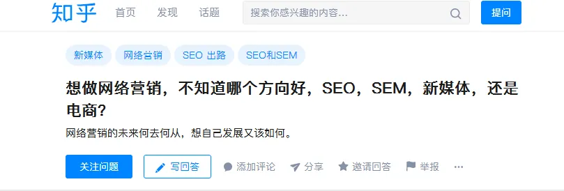 今天笔者在知乎上看到一个非常有意思的话题,有网友在知乎上提问:“想做网络营销,不知道哪个方向好,SEO,SEM,新媒体,还是电商?”这里笔者就来给大家唠唠网络营销应该朝哪个方向发展,SEO、SEM、新媒体还是电商?