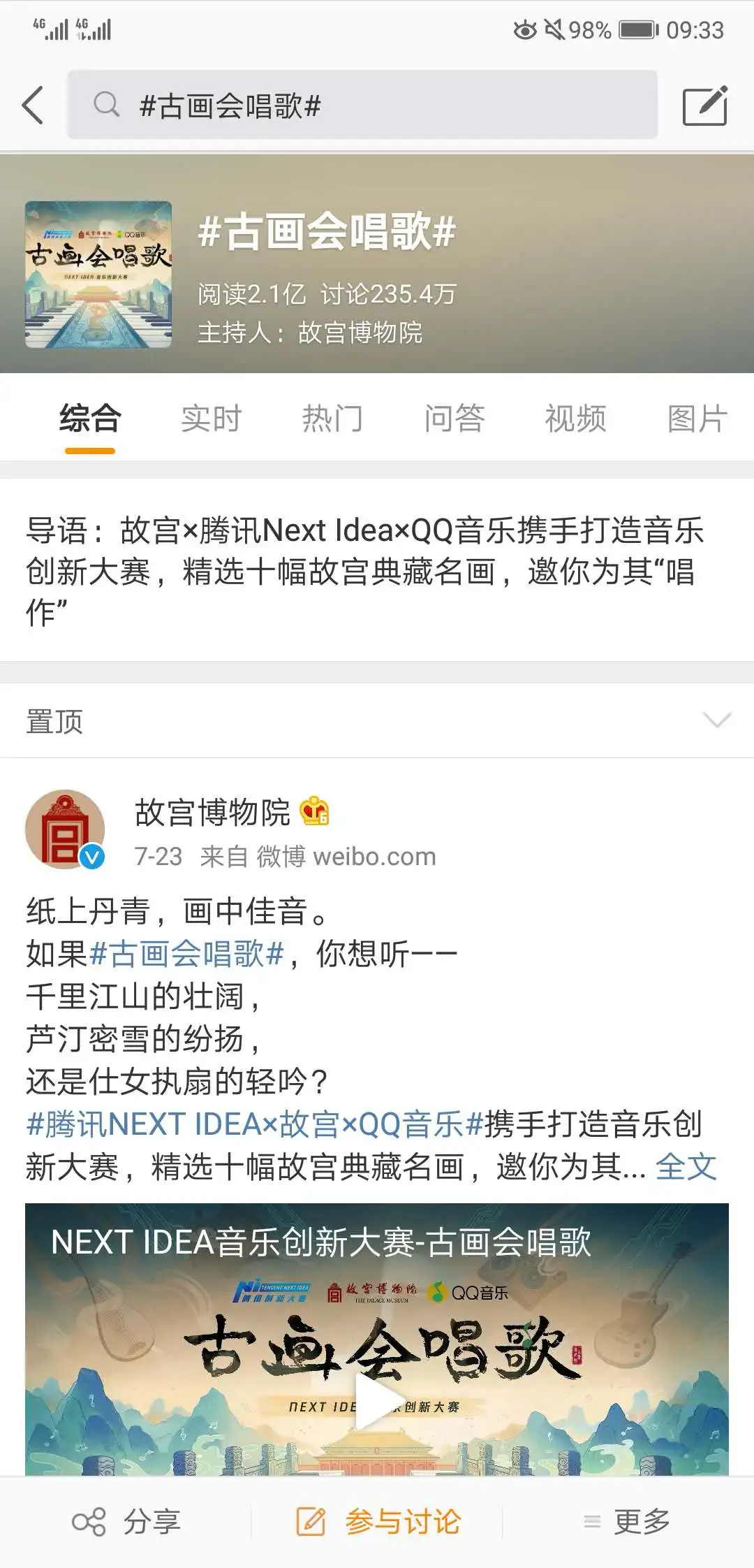 广告主推广账号中的置顶微博:“纸上丹青,画中佳音”等等,来引出古画会唱歌的活动。