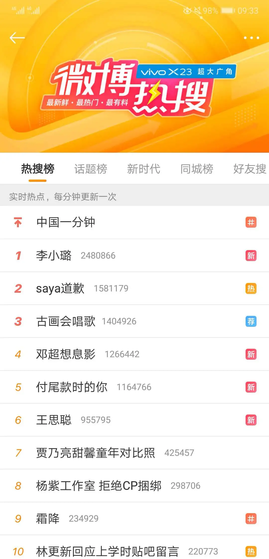 微博热搜榜是在热搜榜第三/顺位,并且带有蓝色“荐”字,微博热搜榜广告是以六轮播的方式出现的。