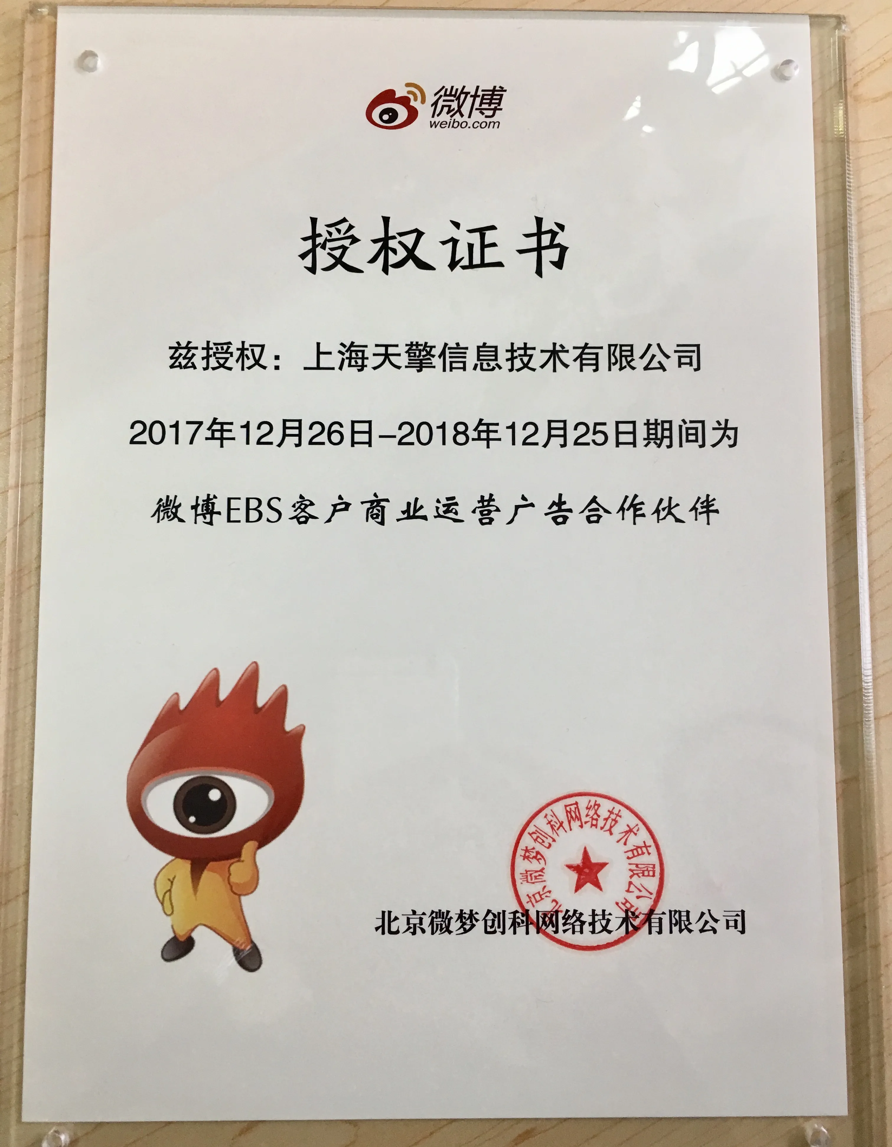 上图为上海天擎是微博代理商授权证书