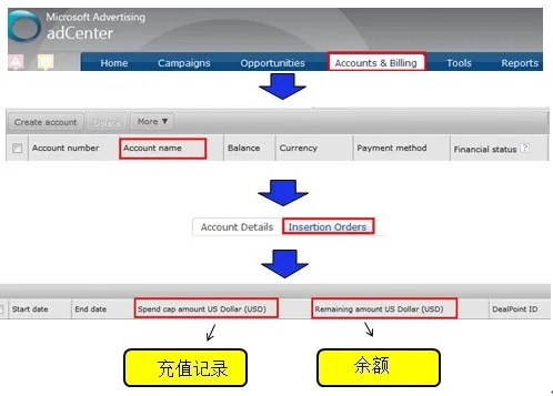 如果您在看到微软BING(必应) AdCenter 后台英文界面,不知道从哪里查看您账户的充值金额及余额时,您可以按照以下图片显示流程可以轻松查看账户充值金额及余额: