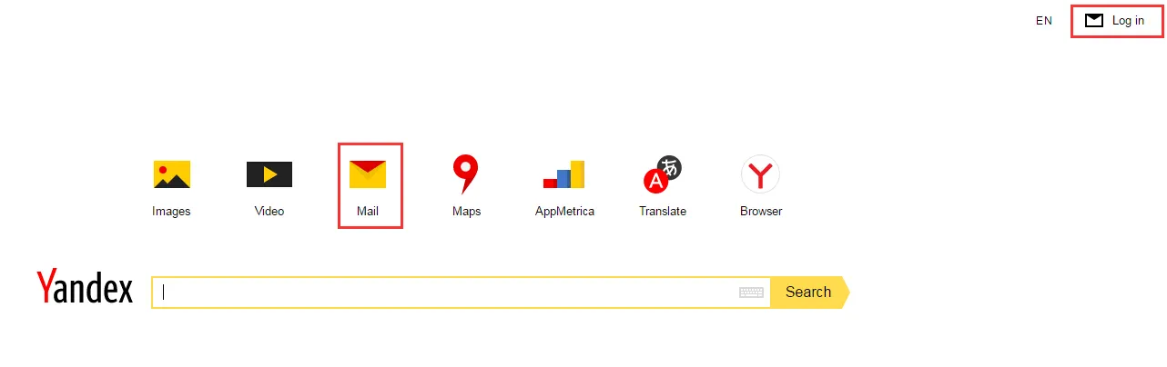 第二,在网页的右上角找到“Log in”,这是yandex账户的登入入口,如果你没有yandex账户,那么它就会跳转至注册页面。或者可以点击页面正中间的“mail”按钮,也可以到达yandex的邮箱登入页面。