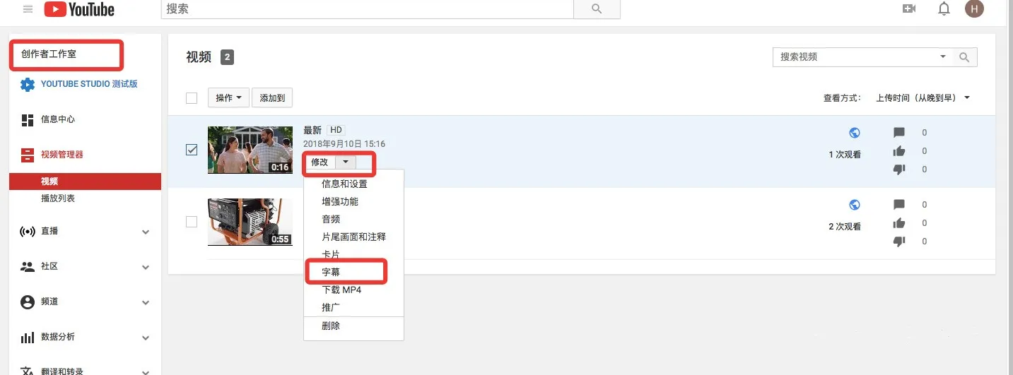 首先,我们先在YouTube上上传视频。进入你的YouTube工作后台,上传一个视频后,你可以看到右下角有个下拉的三角,点击下拉的三角,你就看到“字幕”: